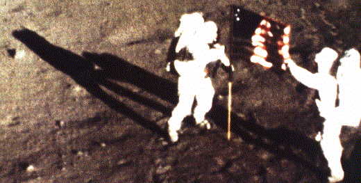 mostra dois astronautas ao lado de uma bandeira americana. A sombra